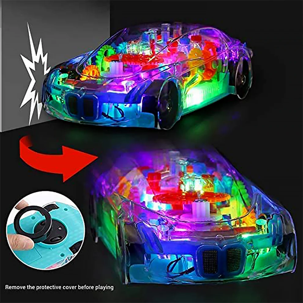 360° Rotating Gear Car Toy with Music & 3D Lights – Transparent Body (Multicolor)
